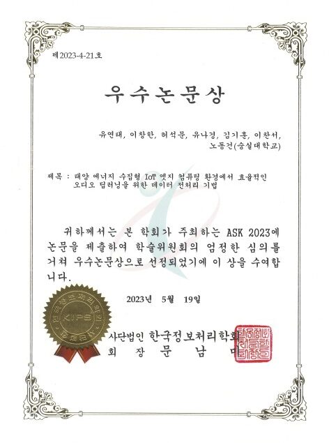 2023년 ASCK 우수논문상 수상 2023년 7월 27일 2023년 한국정보처리학회(Annual Spring Conference of KIPS) 우수논문상 수상 “태양 에너지 수집형 IoT 엣지 컴퓨팅 환경에서 효율적인 오디오 딥러닝을 위한 데이터 전처리 기법”