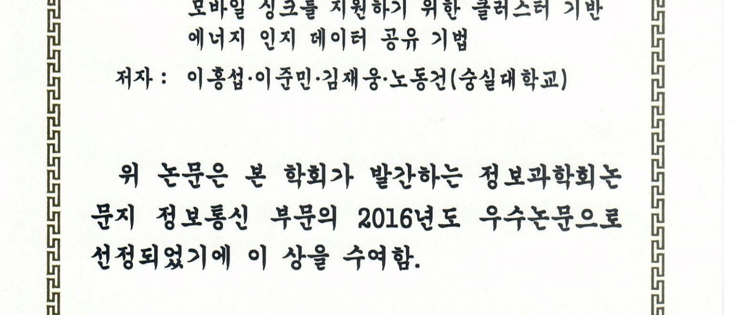 2016년 정보과학회 정보통신부문 우수논문상 수상