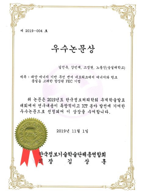 2019년 한국정보처리학회 추계학술발표대회 우수 논문 정총연합회장상 수상 2020년 9월 5일 2019년 한국정보처리학회 추계학술발표대회 우수 논문 정총연합회장상 수상 “태양 에너지 기반 무선 센서 네트워크에서 에너지와 링크 품질을 고려한 향상된 FEC 기법”