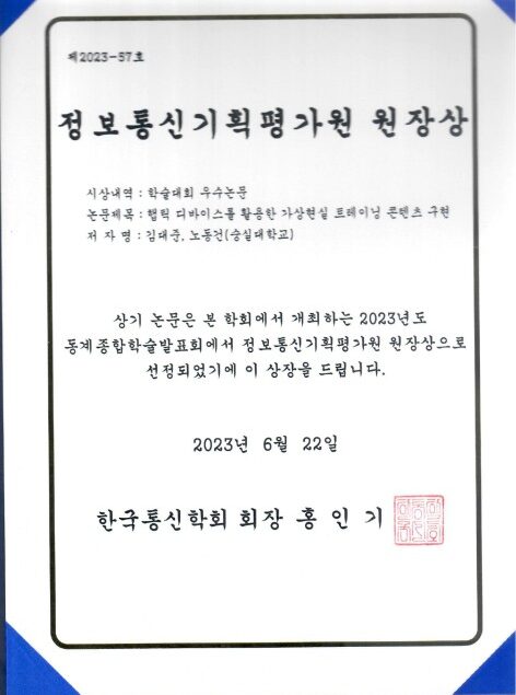 2023 동계종합학술발표회 정보통신기획평가원 원장상 수상 2023년 8월 8일 2023년 동계종합학술발표회 정보통신기획평가원 원장상 수상 “햅틱 디바이스를 활용한 가상현실 트레이닝 콘텐츠 구현”